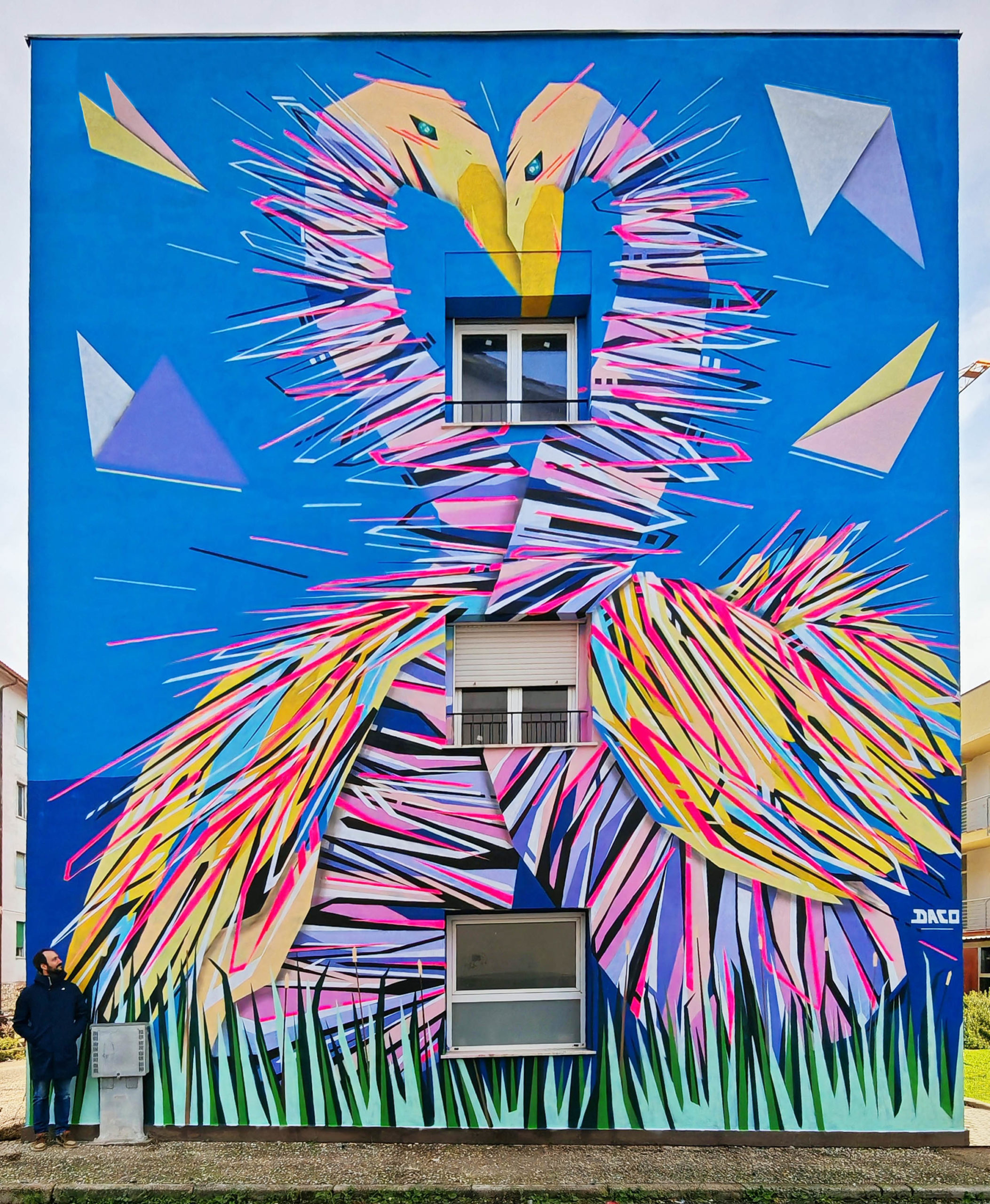 Graffaunes Constructions Projets Shop Bio Graffaune Cygnes Réalisation d'une fresque de 12m x 9m pour le GemellArte festival Terni / novembre 2025