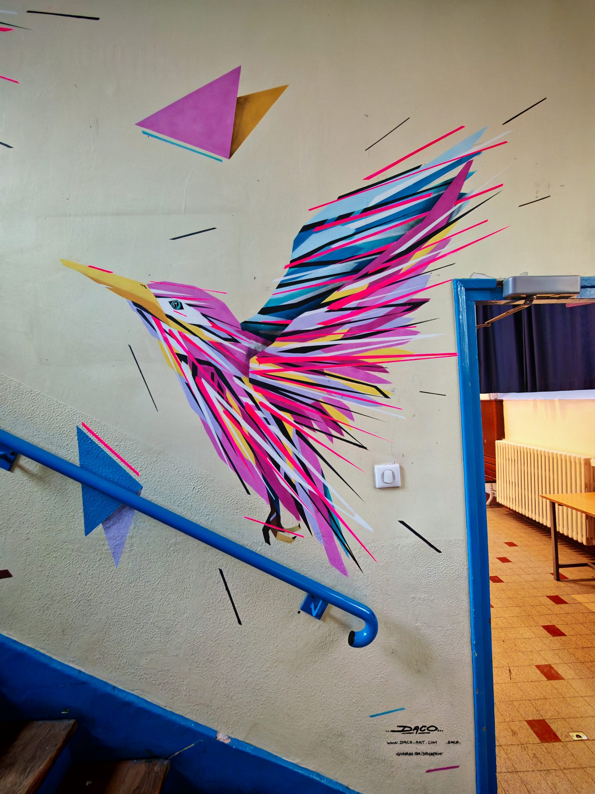 Graffaunes Constructions Projets Shop Bio Graffaune envolée Réalisation d'une fresque au sein de l'école élémentaire de l'Arbalète dans le 5ème arrondissement Paris / décembre 2025